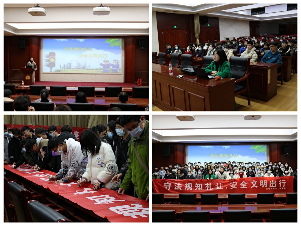 组织开展交通安全主题宣传。学院组织各班级学生以主题班会、政治学习等形式,观看《文明出行——新仪制令》《明星名人说交通安全》等视频,深入学习文明出行相关知识。组织学生开展了交通安全承诺签名活动,增强交通安全防范意识。